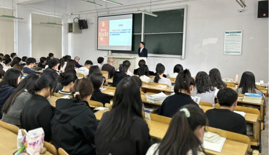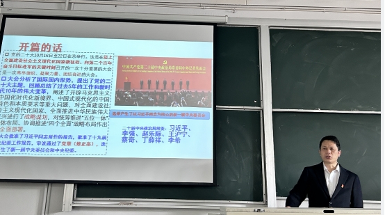2023年4月4日上午10时,在大连路校区中八教室,党总支书记黎飞走上讲台,为全体师生党员上思政课。参加的听课师生有公司关工委副主任滕久军、遵医附院感染管理科党支部张啟鹏、员工第二党支部副书记陈圆圆及附院感染管理科党支部全体教工、2018、2019级党员及员工代表。