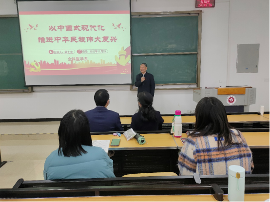 系党总支书记黎飞强调,党的二十大是在我国迈上全面建设社会主义现代化国家新征程、向第二个百年奋斗目标进军的关键时刻召开的一次十分重要的大会,举国关注、世界瞩目。全科医学系全体师生要认真学习,学深学透。